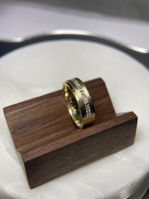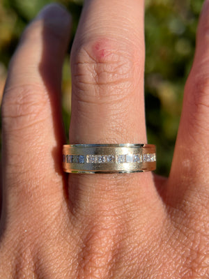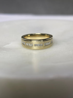 Let's cut to the chase. Men love straight and symmetrical designs. This stunning men's wedding band is sure to grab his heart. Adding masculinity to diamonds, this men's band delivers just that. The brushed gold meshes extremely well with the diamonds.Diverging from traditional men's wedding bands, this band is fashioned with sections of three princess cut diamonds. The unique design of this men's ring emphasizes on the gold rather than the diamonds. With brushed gold in full focus, and diamonds for contrast, what more can a man ask for?