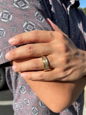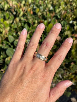 • Heat and Brilliance: A lovely men's ring with diamonds for additional sparkle. The space between the rows of diamonds deliver a more spacious look and feel, making the wedding band itself, stand out. The diamonds are second to the beautiful design of this men's wedding band.