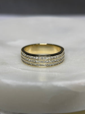 Get your man the beautiful ring that he deserves. This wedding band takes the cake for brilliance and style. Diverging from traditional men's wedding bands, this wedding band is fashioned with three rows of diamonds, separated by a bar of gold. This creates a beautiful symmetrical look that all men crave for in jewelry.