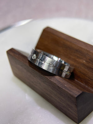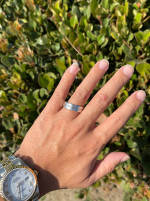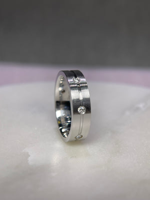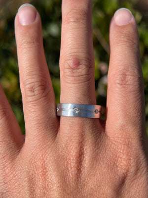 This brushed centered diamond wedding band takes the cake for trendy and stylish. Diverging from traditional men's wedding bands, this appealing wedding band blends the beauty of symmetrical lines with brushed gold and diamonds.