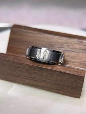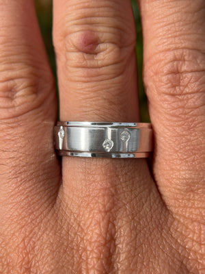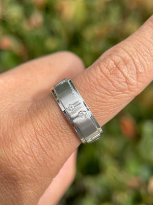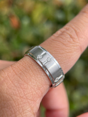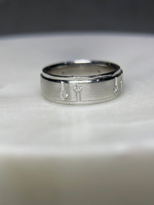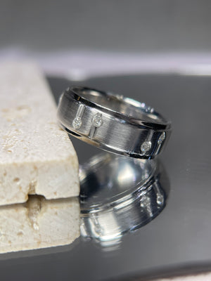 • Heat and Brilliance: A lovely men's ring with diamonds for additional sparkle. The space and line between the diamonds deliver a more unique style that uses diamonds as a complement, as opposed to being the main focus. This makes the wedding band itself, stand out. The diamonds are second to the beautiful design of this men's wedding band.