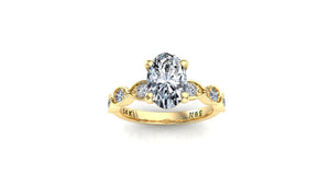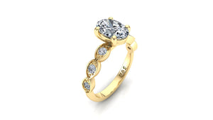 An engagement ring that eclipses the passage of time itself. This engagement ring features a timeless marquise style band, blended with a classical milgrain finish.  Set in 14K solid gold, the center stone features the highest quality moissanite on the market, a 8x6mm (1.50ct) ForeverOne Colorless Oval Moissanite. With 69-70 facets this oval moissanite shines with a brilliance greater than an oval diamond of the same size. The elongated nature of an oval cut stone gives the illusion of a larger stone and a more slick appearance.
