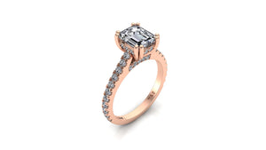 Introducing traditional with a hint of classy. This gorgeous radiant moissanite engagement ring features a 7x5mm(1.20 carat) radiant moissanite tightly secured by vintage fishtail prongs. A diamond bridge right below the center stone adds sparkle and uniqueness. The center stone is set with a lovely 7x5mm(1.20 carat) ForeverOne Radiant Moissanite; the highest quality moissanite on the market. ForeverOne radiant moissanite is a hybrid that consists of the alluring emerald shape matched with the brilliance of the great round cut. It's an emerald cut with more fire than you can handle. It boasts 53-54 facets, giving it an enchanting brilliance only matched by the round brilliant. Under most lighting, This ring will definitely shine brighter than any other diamond.