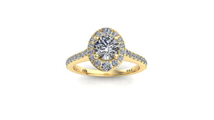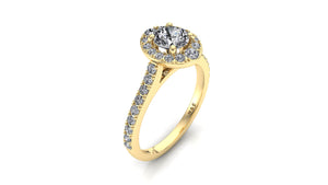 Introducing traditional with a hint of classy. This gorgeous moissanite engagement ring features a 5.5mm(0.60 carat) round brilliant moissanite comfortably wrapped by a dazzling diamond halo. The center stone sits on top of a cathedral setting complemented by a beautiful halo. The center stone is set with a lovely 5.5mm(0.60 carat) ForeverOne Round Moissanite; the highest quality moissanite on the market. ForeverOne round moissanite offers the greatest brilliance of all moissanites. It boasts 57-58 facets, giving it an enchanting brilliance unmatched by other stones. Under most lighting, This ring will definitely shine brighter than any other diamond.
