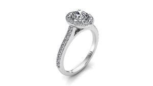 • Traditional and Trendy: The center stone sits on top of a traditional cathedral setting and is complemented by a diamond halo. The cathedral setting adds height to the ring and the halo around the moissanite makes the center stone appear larger. The diamond halo around the center stone rounds out the whole ring by giving it additional brilliance and exuberance.