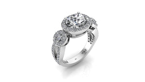 • Traditional and Trendy: The center stone is set in east-west fashion and is complemented with two lovely round brilliant diamonds. Halos of diamonds wrap around each main stone for added brilliance