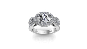 Introducing traditional with a hint of classy. This gorgeous three stone oval moissanite engagement ring features a dazzling 8x6mm(1.50 carat) oval cut moissanite. The center stone is supported by two dazzling round brilliant diamonds (0.15ct tw). A halo of diamonds wrap around each center stone to give a larger appearance. The center stone is set with a lovely 8x6mm(1.50 carat) ForeverOne Oval Moissanite; the highest quality moissanite on the market. ForeverOne oval moissanite offers the greatest brilliance of all moissanites. It boasts 69-70 facets, giving it an enchanting brilliance unmatched by other stones. Under most lighting, This ring will definitely shine brighter than any other diamond.