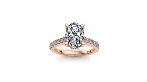 An engagement ring that eclipses the passage of time itself. This engagement ring uses our popular Jennifer setting and features a beautiful oval moissanite with a petite underhalo.  Set in 14K solid gold, the center stone features the highest quality moissanite on the market, a 9x7mm (2.10ct) ForeverOne Colorless Oval Moissanite. With 69-70 facets this oval moissanite shines with a brilliance greater than an oval diamond of the same size. The elongated nature of an oval cut stone gives the illusion of a larger stone and a more slick appearance.