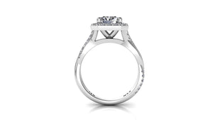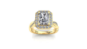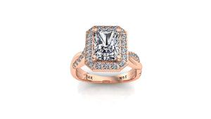 8x6mm (1.80ct) Kylie ForeverOne Radiant Moissanite Diamond Halo Half Twist 14K Gold Engagement Ring MOENG046