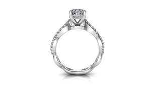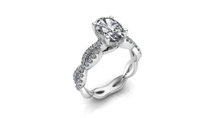 An engagement ring that eclipses the passage of time itself. This engagement ring features an alluring 8x6mm (1.50ct) Charles and Colvard ForeverOne oval moissanite at the center. Fitted with a petite underhalo, the ring is designed with an infinity twist and layers of round brilliant diamonds half way around the band.  Set in 14K solid gold, the center stone features the highest quality moissanite on the market, a 8x6mm (1.50ct) ForeverOne Colorless Oval Moissanite. With 69-70 facets this oval moissanite shines with a brilliance greater than an oval diamond of the same size. The elongated nature of an oval cut stone gives the illusion of a larger stone and a more slick appearance.