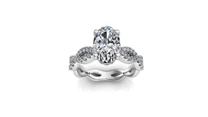 • Slick and Slender: The elongated nature of an oval moissanite gives the illusion of a larger stone and a more slender appearance when worn. The unique infinity twist band is fitted with diamonds half-way across the band for extraordinary sparkle.
