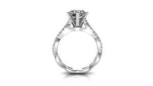 Present a surprising twist of love with this ForeverOne Round Moissanite Engagement Ring. This tantalizing engagement ring combines individuality and beauty. Taking center stage is a breathtaking ForeverOne 7mm (1.20 carat) round moissanite, the highest quality moissanite on the market. The trendy half-twist style band meshes extraordinarily well with the classic round center stone. A combination of this cute little twist with the most popular type of cut gives this ring a new look.