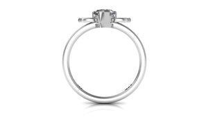 • Top Quality Centerstone: The center stone is fitted with a 6mm (0.80 carat) ForeverOne Pear Moissanite. The highest quality moissanite offered by CharlesandCovard.