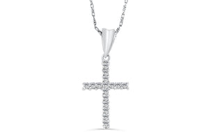 A simple but elegant diamond cross pendant that draws eyes to the neckline. With a total diamond weight of 0.26 carats, the face of this beautiful cross pendant is completely lined with dazzling round diamonds. An array of beautiful diamonds draw attention towards the pendant.