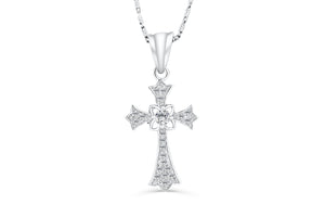 A captivating design, this delicious diamond cross pendant features a triple-tipped point on each ends of the cross, with a 0.18 carat sparkling round diamond center stone enclosed in a floral design.  To complement, round brilliant diamonds outline the cross totaling a diamond carat weight of 0.27