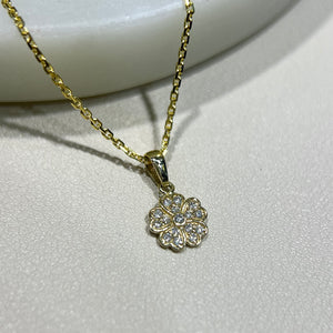 Delicately handcrafted, this piece features a charming flower-shaped pendant with soft, rounded petals outlined in radiant gold. At the heart of each petal is a brilliant diamond, carefully set to sparkle with every movement. A single center stone ties the entire blossom together—symbolizing unity, love, and life in full bloom.