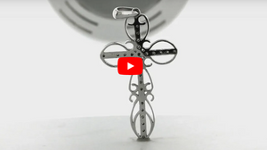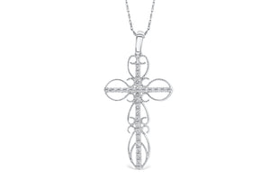 A captivating design, this unique diamond cross pendant is sure to bring out your individuality. Crafted in beautiful 14K white gold, this diamond cross pendant features an array of mesmerizing round brilliant diamonds fitted perfectly on the cross.  For added flavor, milgrain framed white gold spirals wrap around the cross.