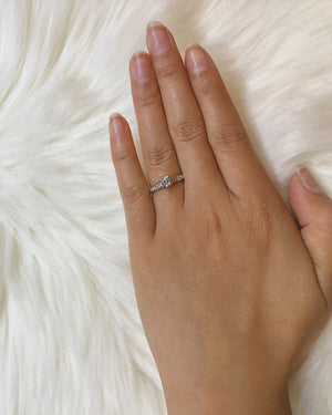 Express a heartfelt message to her with this Pave set diamond engagement ring. Crafted in brightly polished 14K gold, this ring features a 0.39 carats round brilliant diamond center stone set in a four prong setting with additional diamonds along the shank to complete this style.