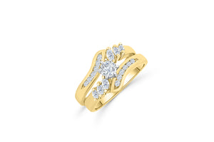 Begin your endless love story with this magnificent engagement ring set. Safely secured by a six prong setting, this dazzling 0.29 carats round brilliant center diamond speaks for itself. The shank is adorned with a row of channel set round brilliant diamonds on one side, and a trio of dazzling marquise cut diamonds on the other. To finish the style, a matching wedding band is included.