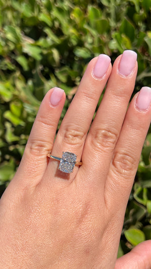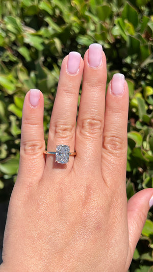 The Sophi features a lab grown radiant diamond with a beautiful hidden secret halo set in a modern floating setting. The gorgeous secret halo follows the shape of the center stone to create a beautiful design that is for your eyes only. The Sophi uses a 1.7mm gold band that centers all the focus onto the diamond. The radiant diamond is elongated and cut like a 2.80ct size