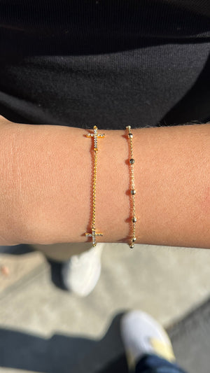 One of the cutest dainty gold bracelets that we are absolutely in love with! The dainty design allows easy stacking with other bracelets, making this bracelet an easy starter piece. This triple diamond cross charm bracelet is perfect for any cute fashionable lovers. Three beautiful crosses sit around the wrist to ensure a diamond cross is seen from each angle. Diamonds are fitted inside each cross design to create sparkles when light hits the piece. Made with a 1.3mm solid 14K gold Rolo chain, this bracelet was made for everyday wear.