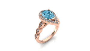 Give her an everlasting love with this breathtaking milgrain pear cut blue topaz engagement ring. This mesmerizing engagement ring was made to feature the pear cut. A unique pear style milgrain diamond band, combined with a trendsetting pear cut morganite. The center stone is set with a lovely 9x6mm(1.30 carat) pear blue topaz and a diamond halo for maximum sparkle. One of the fanciest shapes available, our pear blue topaz ring is fashioned with a beautiful baby blue and a diamond halo, giving it an enchanting brilliance unmatched by other stones.