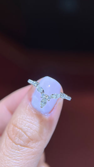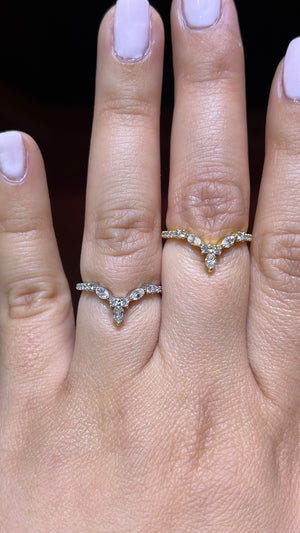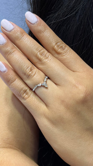 Simple, yet stunning, this lovely chevron diamond band is the perfect piece for dainty wear. This tantalizing diamond band features alternating round and marquise diamonds to create this breathtaking design. Beautiful and unique, the center of the band is what captivates. Diamonds in the center create a beautiful V shape, this band brings a new meaning to individuality. The unique band adds a fresh and modern appeal. The perfect addition for someone looking to add a little spice to their engagement ring, but also unique enough to work as a solo piece stacked with other bands.