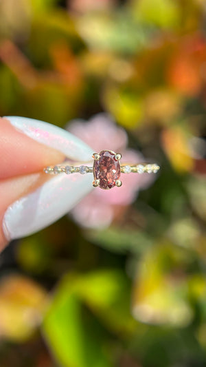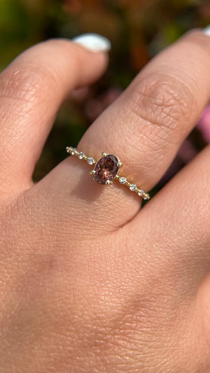 Enhance your everyday jewelry game with the beautiful dainty Bella in Gems. The Bella utilizes a spaced diamond band style to create a unique design that sparkles on the sides and stays focused in the middle. A favorite choice for many, the Bella is fitted with a 6x4mm natural color changing garnet gemstone at the center, which is famous for its beautiful vibrant light brown color that turns to red under different lighting.