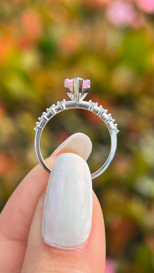 Enhance your everyday jewelry game with the beautiful dainty Bella in Gems. The Bella utilizes a spaced diamond band style to create a unique design that sparkles on the sides and stays focused in the middle. A favorite choice for many, the Bella is fitted with a 6mm synthetic pink ice gemstone at the center, which is known for its beautiful vibrant light pink color with an unmatched brilliance.