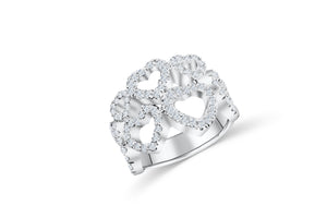 The greatest statement of love. This luxurious diamond ring features two rows of distinct sized hearts. Showcasing the beauty of hearts, each heart is adorned with round brilliant diamonds. This stunning ring represents love in many shapes and forms.