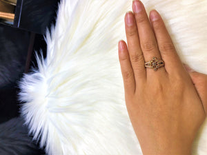 Boasting a bold design, this V split chocolate diamond ring possesses contrasting colors of light and dark. The round brilliant white diamonds layered on top of the V split are sure to bring focus towards the dazzling chocolate diamonds. The chocolate diamonds represent the circle of life, and the white translucent diamonds represent life breeding from each focal point. The total weight of the chocolate diamonds are 0.45 carat and the side diamonds are 0.26 carat.