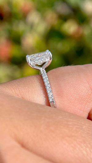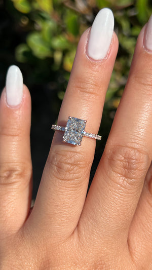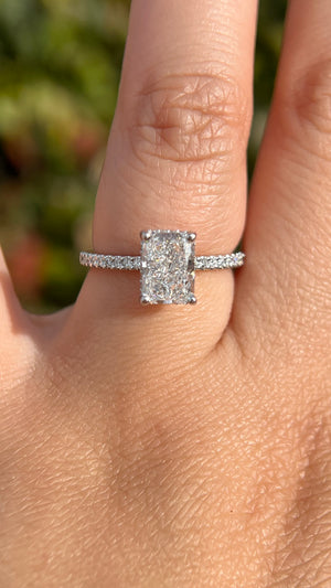 The Jada features a lab grown radiant diamond with a hidden halo in a tiffany floating setting. The Jada uses a 1.7mm pave classic diamond band to create a gorgeous dainty style that blends modern with timeless. The radiant diamond is elongated and cut like a 2.50ct size