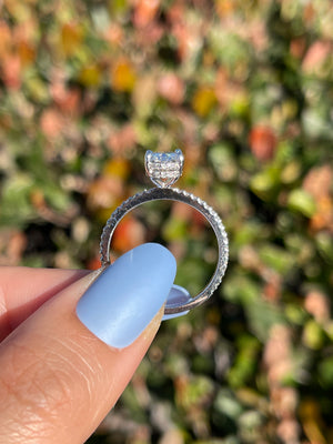 The Jada features a lab grown oval diamond with a double hidden halo in a tiffany floating setting. The Jada uses a 75% eternity 1.7mm pave classic diamond band to create a gorgeous dainty style that blends modern with timeless. The oval diamond is elongated and cut like a 1.80ct size