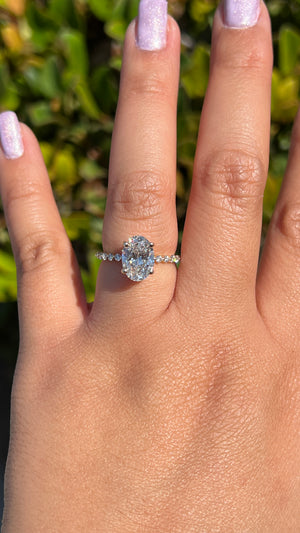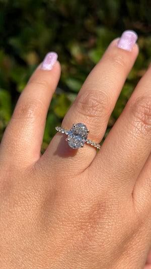 The Iris features a lab grown oval diamond set in a tiffany floating setting. A beautiful hidden halo is added for your eyes only. The Iris uses a bubble diamond band setting that utilizes the shared prong setting. This allows the side diamonds to sparkle more brilliantly. The oval diamond is elongated and cut like a 2.30ct size