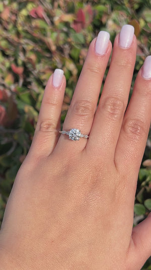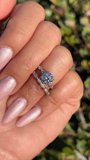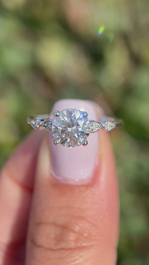 The Paige features a lab grown round diamond in a gorgeous vintage-inspired setting. Vintage doesn't have to be big and gaudy, it can be dainty and cute. The setting utilizes a milgrain-beaded pear shaped design that surrounds the accent diamonds to create this beautiful unique design. This gives the unique pear shape of the ring, without sacrificing sparkle.