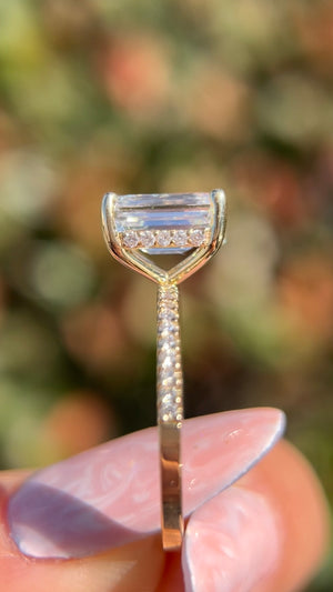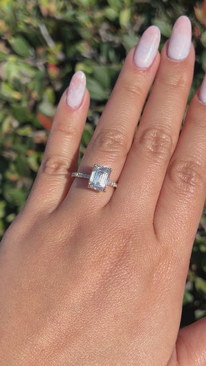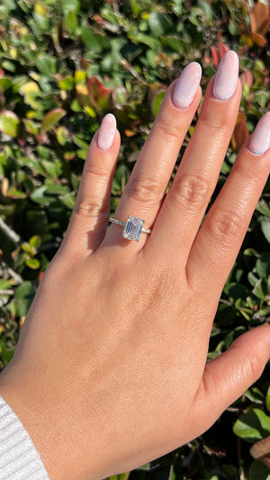 The Jada features a lab grown emerald diamond with a hidden halo in a tiffany floating setting. The Jada uses a 1.7mm pave classic diamond band to create a gorgeous dainty style that blends modern with timeless. The emerald diamond is elongated and cut like a 3.40ct size