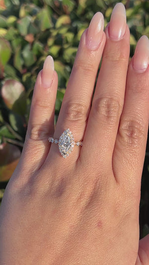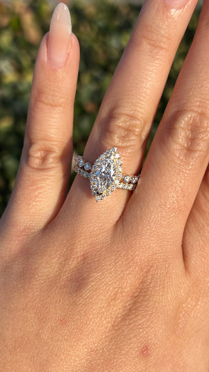 The Isa features a lab grown marquise diamond with a diamond halo set in a tiffany floating setting. The Isa uses a larger bubble diamond band setting that utilizes the shared prong setting. This allows the side diamonds show less gold and to sparkle more brilliantly. The marquise is nicely elongated and looks like a 1.20ct size.