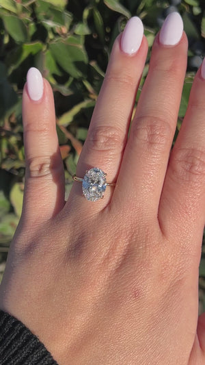 The Sandy features a lab grown oval diamond with a unique double hidden secret halo set in a modern floating setting. The gorgeous secret halo follows the shape of the center stone to create a beautiful design that is for your eyes only. The Sandy uses a 1.8mm gold band that centers all the focus onto the diamond. The oval diamond is elongated and cut like a 4.40ct size