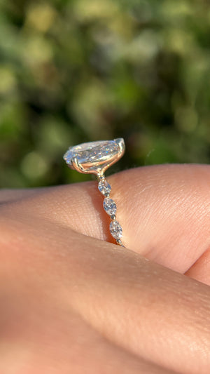 The Marli features a lab grown oval diamond in a tiffany floating setting. The Marli is a unique ring that utilizes sharp and slim marquise diamonds on the band that form along your fingers. A stunning and unique choice that maintains a dainty look. The pear diamond is elongated and cut like a 1.80ct size