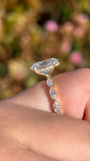 The Mandy features a lab grown oval diamond in a tiffany floating setting. The Mandy is a unique ring that utilizes sharp and slim marquise diamonds on the band that form along your fingers. A stunning and unique choice that maintains a dainty look. The oval diamond is elongated and cut like a 3.90ct size