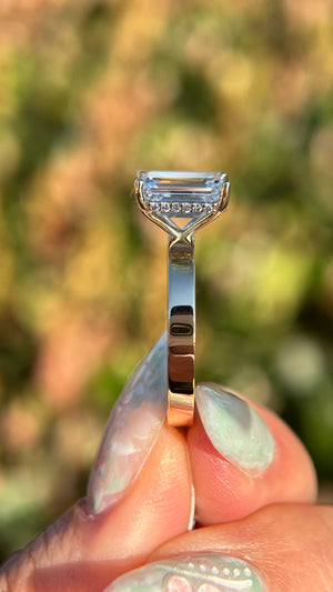 The Andrea features a lab grown radiant diamond set in a stunning floating solitaire setting. The Andrea is a trendy and thicker solitaire than usual. It uses a 2.5mm comfort fit solitaire band that focuses all the attention on the gorgeous oval diamond. The Radiant diamond is elongated and cut like a 3.10ct
