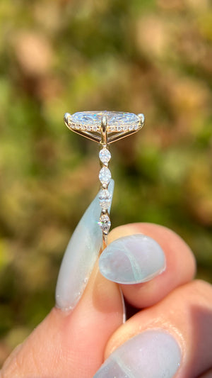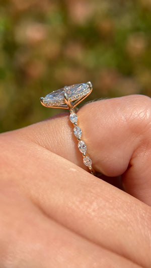 The Marli features a lab grown oval diamond in a tiffany floating setting. The Marli is a unique ring that utilizes sharp and slim marquise diamonds on the band that form along your fingers. A stunning and unique choice that maintains a dainty look. The oval diamond is elongated and cut like a 2.10ct size