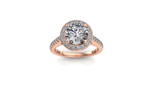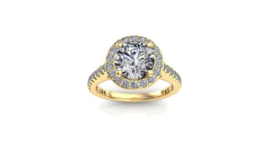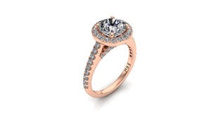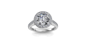 Introducing traditional with a hint of classy. This gorgeous moissanite engagement ring features a 6.5mm(1.00 carat) round brilliant moissanite comfortably wrapped by a dazzling diamond halo. The center stone sits on top of a cathedral setting complemented by a diamond bridge right below. The center stone is set with a lovely 6.5mm(1.00 carat) ForeverOne Round Moissanite; the highest quality moissanite on the market. ForeverOne round moissanite offers the greatest brilliance of all moissanites. It boasts 57-58 facets, giving it an enchanting brilliance unmatched by other stones. Under most lighting, This ring will definitely shine brighter than any other diamond.