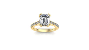 Introducing traditional with a hint of classy. This gorgeous Jennifer emerald cut moissanite engagement ring features a 7x5mm(1.00 carat) emerald moissanite tightly secured by vintage fishtail prongs. A diamond bridge right below the center stone adds sparkle and uniqueness. The center stone is set with a lovely 7x5mm(1.00 carat) ForeverOne Emerald Moissanite; the highest quality moissanite on the market. ForeverOne emerald moissanite is nearly flawless and colorless. It's an emerald cut with more fire than you can handle. The 45-46 facets, create silky smooth lines as enchanting and as brilliant as the round brilliant. Under most lighting, This ring will definitely shine brighter than any other diamond.