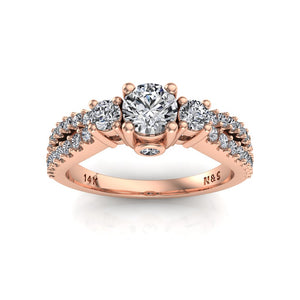 • Fiery Brilliance: Supporting the three main stones is a split shank band inlaid with sparkling round brilliant diamonds. For further brilliance, two round brilliant diamonds are set on the side of the band.