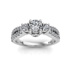 A magnificent gift of love, this ForeverOne Round Moissanite Three Stone Engagement Ring is sure to captivate her. This dazzling engagement ring combines individuality and beauty. Taking center stage is a breathtaking ForeverOne 4.5mm (0.33ct) round moissanite, the highest quality moissanite on the market. Two symmetrical round brilliant diamonds add new depth and create this gorgeous three stone ring. Flanking the side diamonds is a split style shank adorned with round brilliant diamonds. For additional sparkle, a bezel set diamond sits on the side right beneath the center diamond. This alluring engagement ring is sure to sparkle when gazed upon from any direction. A combination of this cute little twist with the most popular type of cut gives this ring a new look.